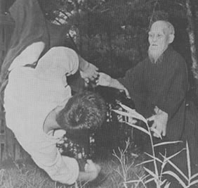 (14 Diciembre de 1883 - 26 Abril de 1969) También conocido como O´Sensei (Gran Maestro) o Kaiso (Fundador). Hijo de Yoroku y Yuki UESHIBA. Nació en TANABE provincia de Kii (actualmente prefectura de Wakayama). Fue el creador de Aikido, el “Arte de la Paz”, luego de haber dedicado toda una vida a la práctica de las Artes Marciales. Algunas de estas fueron: TENJIN SHIN'YO-RYU JUJUTSU bajo la enseñanza de Tokusaburo TOZAWA (Tokio - 1901), GOTO-HA YAGYU SHINGAN-RYU bajo Masakatsu NAKAI (ciudad de Sakai - 1903 a 1908), Judo bajo Kiyoichi TAKAGI (Tanabe – 1911), DAITO-RYU JUJUTSU bajo Sokaku TAKEDA (Hokkaido – 1915). Ueshiba estuvo influenciado espiritualmente por la religión OMOTO - KYO, especialmente por los pensamientos del reverendo Onisaburo DEGUCHI. En el año 1924 lo acompaña a Manchuria y Monglia con el objetivo de fundar una colonia utópica. Es tomado como prisionero por militares en su paso por China y finalmente liberado gracias a las influencias del gobierno japonés. En 1931 establece el Dojo Kobukan, centro de sus actividades, en donde durante 11 años se dedica a la enseñanza de Daito-ryu Aikijujutsu. Gradualmente comienza a separarse de Sokaku Takeda y comienza a llamar a su Arte Aiki Budo. Al final de la Segunda Guerra Mundial Ueshiba deja de enseñar en Tokio y se retira a la Región de IWAMA prefectura de IBARAKI (ver galeria). En donde se dedica a una vida mas austera de intenso entrenamiento, meditación y al trabajo del campo. Es en el año 1942 que el nombre de AIKIDO se torna oficial y es reconocido por el ministerio de educación de Japón. Ueshiba recibió en 1960 la condecoración Shiju Hosho (Medalla de Honor de la Cinta Púrpura) del gobierno de Japón. Sus últimos años los pasó en Tokyo principalmente en donde su salud fue decayendo gradualmente. A pesar de esto continuó dictando clases hasta que en Febrero de 1969 enferma y es internado en el Hospital de Keio. Es dado de alta y se retira a su hogar en donde el 26 de Abril fallece de cáncer de hígado. Ueshiba dictó clases a cientos de estudiantes durante más de 50 años de enseñanza. Se caracterizó por una visión ética, humanista y compasiva de las Artes Marciales. Nutrió al Aikido con una profunda filosofía la cual hace prevalecer por sobre todo, el concepto de la no violencia en vez de la victoria por sobre el adversario.